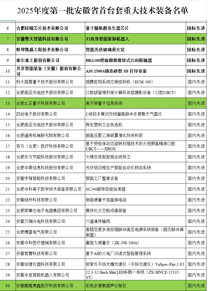 近日,安徽省经济和信息化厅公布2025年度第一批安徽省首台套重大技术装备名单。擎天智能的“T2具身智能装卸机器人”、幺正量子的“离子阱量子信息系统”、鲲隆康鑫的“彩色多普勒超声诊断仪”成功入选,获评安徽省首台套重大技术装备评定是对省内企业原创性、引领性技术成果的高度认可,是体现企业高质量发展的重要标志之一。