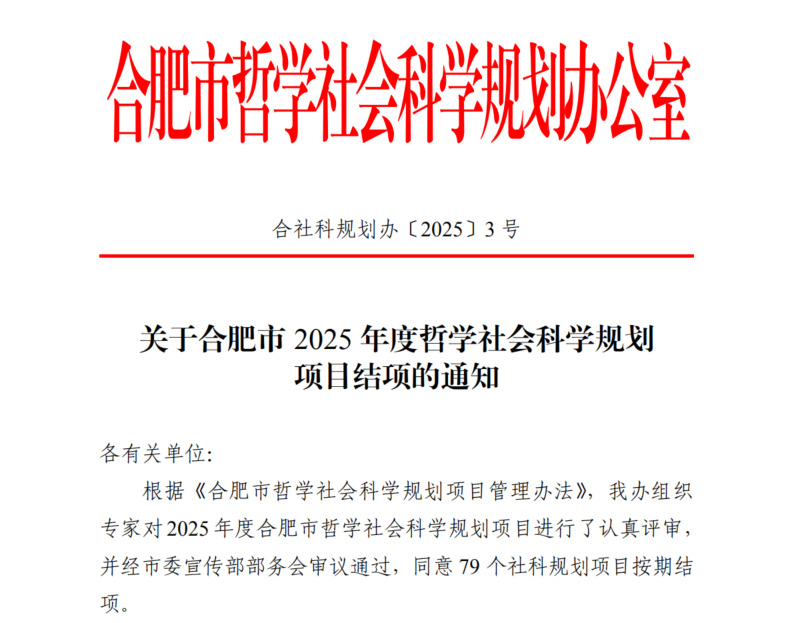 近日,合肥市哲学社会科学办公室公布了2025年度哲学社会科学规划项目评审结果,在结项的79个项目中产生“优秀”等次项目28项。bevictor伟德承担的课题《合肥加强新型研发机构建设实践与对策研究》获评“优秀”等级。